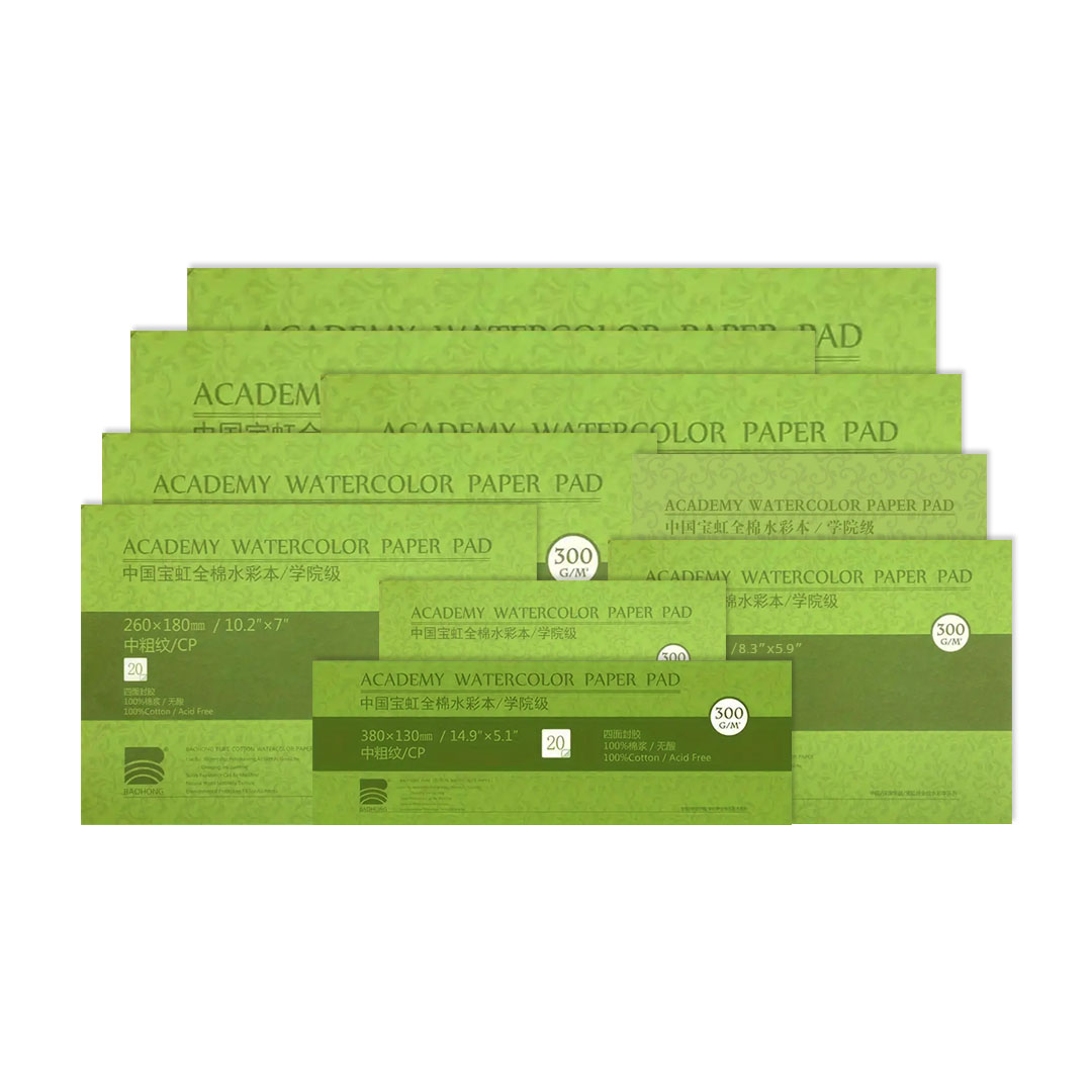 Available in Hot Pressed, Cold Pressed and Rough, 300gsm Baohong Professional Pure 100% Cotton Watercolour Paper.