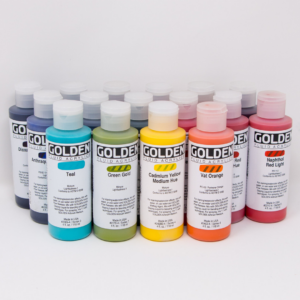 Principal 10 Color Professional Set This wonderful set provides artists with a cost-effective means to setting up a basic palette, capable of mixing a full range of hues, tints, and shades, that can later be supplemented with the wide selection of Fluid color offerings. When mixed with water, or GOLDEN Acrylic Flow Release, the Fluids are very useful for staining or watercolor techniques.