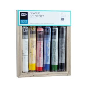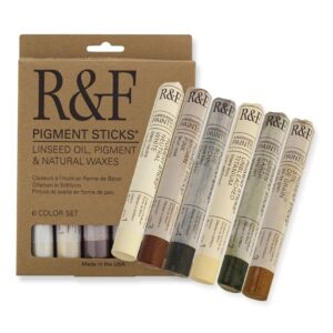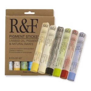 R&F Pigment Sticks® are oil paint manufactured with enough wax for the paint to be molded into stick form. They allow the painter to draw or paint directly onto a surface without brushes, palettes, paint tubes, or solvents. We use only the basic traditional materials: natural wax (beeswax & plant wax), linseed oil, and pigment. The result is an oil stick with a lipstick soft consistency.