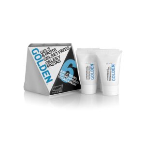 The GOLDEN 6 Acrylic Textures Set of Gel Mediums and Molding Pastes offers the opportunity to experiment with a representative sampling of Gel Mediums. Gel Mediums used alone, or blended with acrylic colors can add texture, broaden the working properties and expand the possibilities. The set includes six 2 fl oz tubes: Soft Gel Gloss, Regular Gel Semi-Gloss, Extra Heavy Gel Matte, Light Molding Paste, Coarse Pumice Gel, Clear Tar Gel. Also included is a product brochure with brief descriptions of product features.