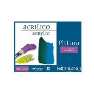 he Fabriano Pittura Acrylic paper are Fourdrinier made paper with prime quality cellulose pulp, high-quality, lignin-free, cold pressed that’s acid-free and archival, guaranteeing inalterability over time. The heavy weight of the paper, its textured surface, and its internal and external sizing make it Ideal for acrylic, recommended for oil and tempera. Blocks are glued on four sides to prevent the paper from warping when wet.