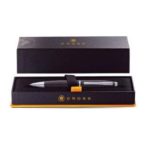 Sleek art-deco inspired lines create a flowing feature of the Cross Calais Ballpoint Pen. A striking two-tone effect of matte black lacquer and lustrous chrome trim create a bold look which complements the simplistic styling. Lightweight and durable, with a twist mechanism, the Calais is a modern classic. Matte black lacquer barrel and cap with lustrous chrome trim- Twist mechanism