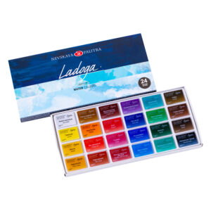 The high quality of Ladoga watercolours guarantees production techniques and control at every stage. Expensive inorganic pigments are replaced with less permanent organic light. Ladogi is characterized by an optimal value which makes it ideal for active and many painting artists and students. Colours included: Zinc White, Lemon, Hanza Yellow, Yellow Ocher, Raw Sienna, Golden, Orange Lake, Red Ocher, English Red, Scarlet, Rose, Madder Lake Red Light, Violet Rose, Blue Lake, Ultramarine, Bright Blue, Turquoise Blue, Yellow Green, Green, Emerald Green, Umber, Burnt Umber, Sepia, Neutral Black. Available in a set of 24 colours 2.5 ml pans.