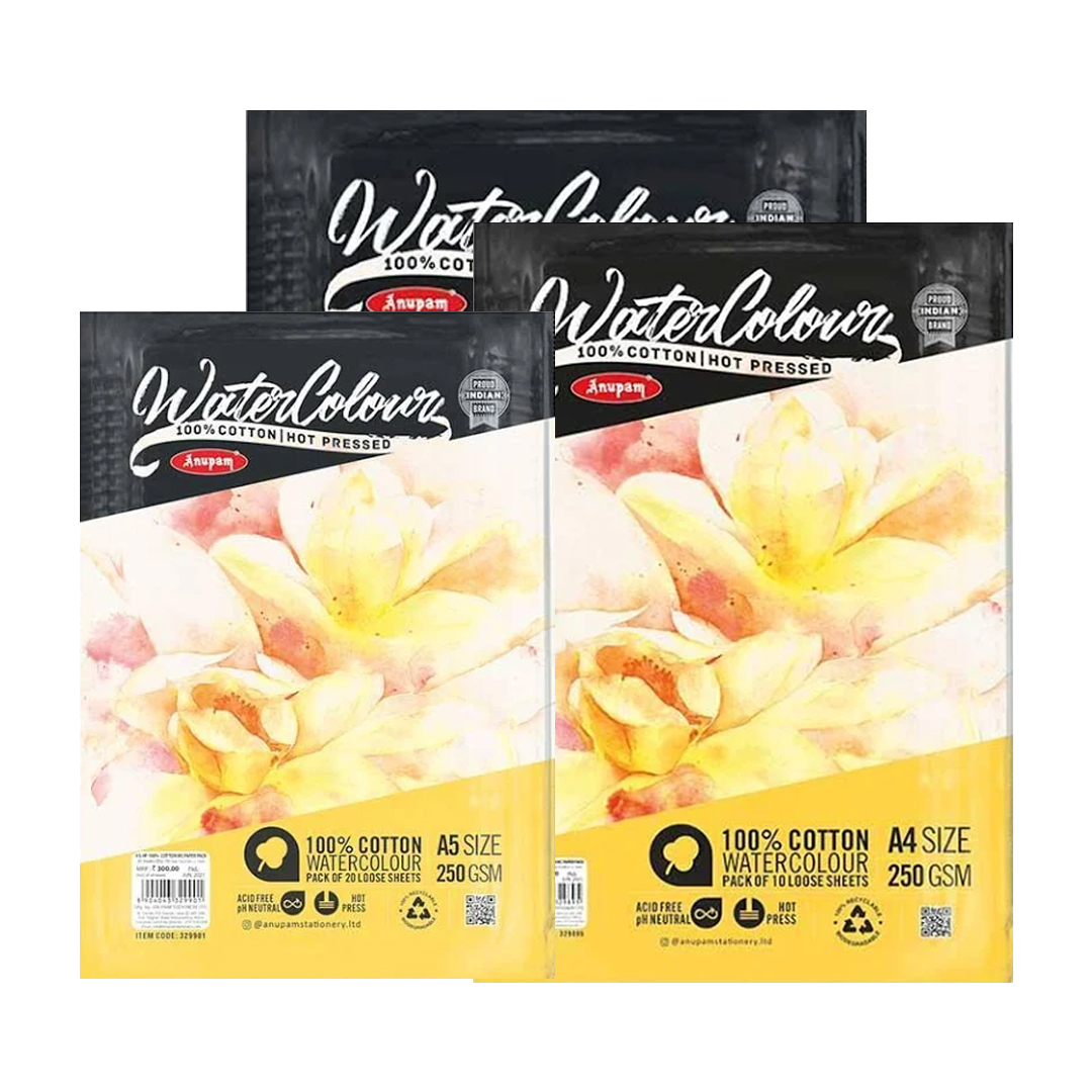 Anupam 100% Cotton Hot Pressed A3 -5 sheets, Anupam 100% Cotton Hot Pressed A4 -10 sheets, Anupam 100% Cotton Hot Pressed A5 -20 sheets |