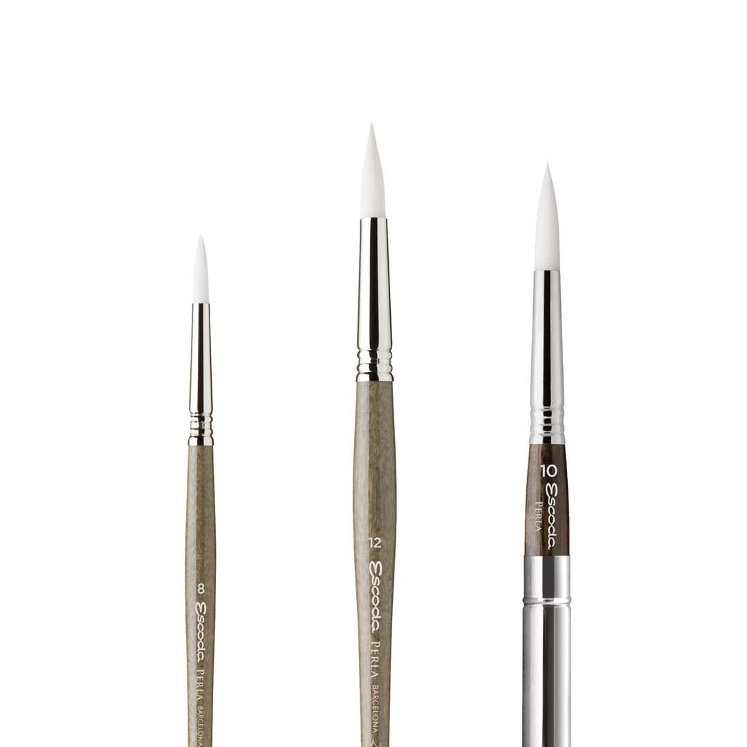 EscodaSignature Collection Joseph Zbukvic Brush Setcontains 3 Perla Brushes. Escoda Perla brushes are White Toray synthetic fibre brushes and are one of the finest quality synthetic fibers available for watercolours.White Toray fiber is one of the softest and is typically used in watercolor. The round brush combines three diameters and three different lengths, achieving a perfect tip. It has a capacity to retain a large amount of paint.