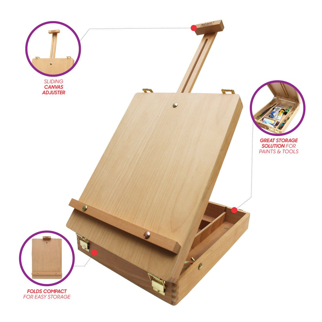 • An ideal solution for any travelling artist, a French Easel Design with large interior storage box constructed of oil or Varnished beechwood.