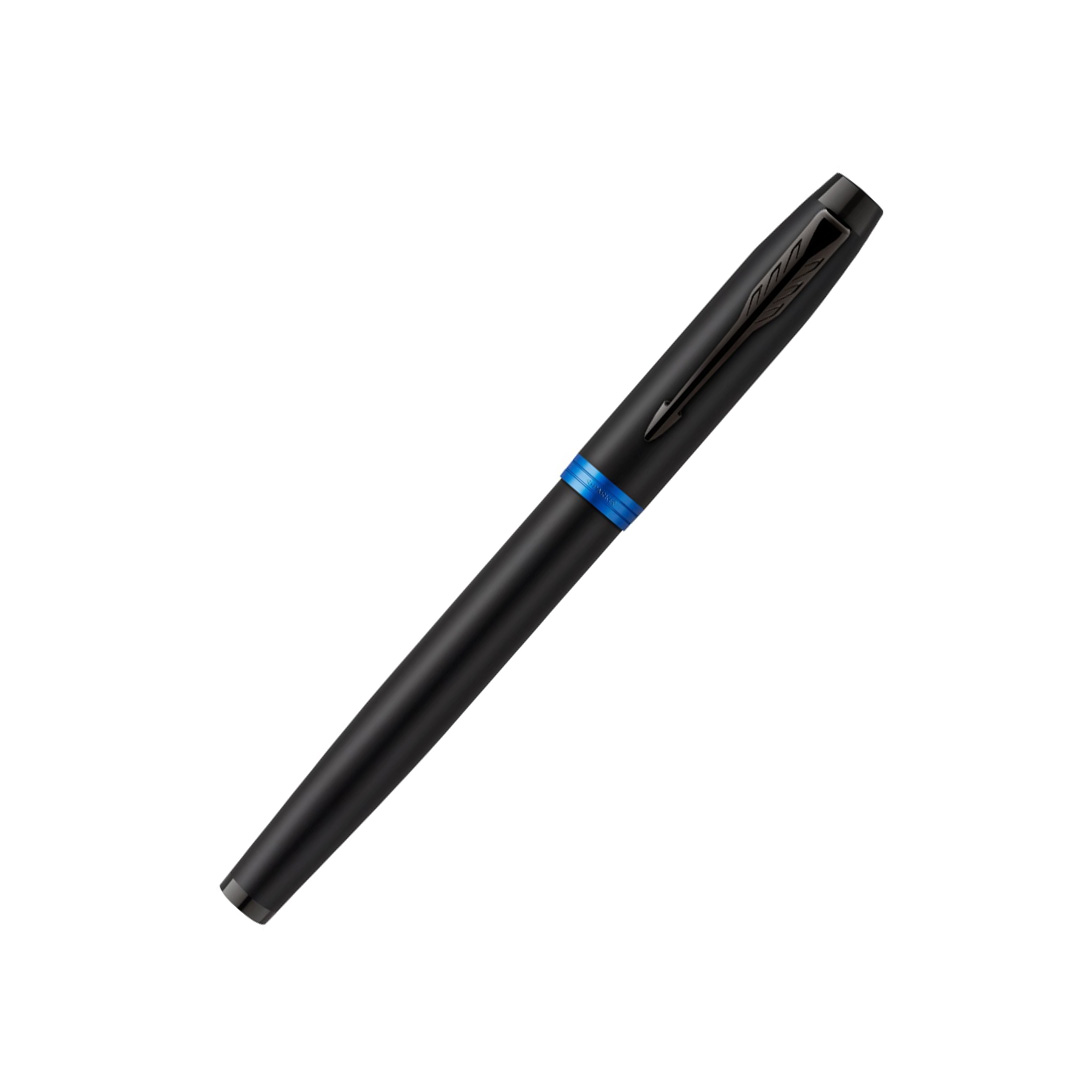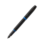 - Parker pen with all-black finishes and marine blue ring accents