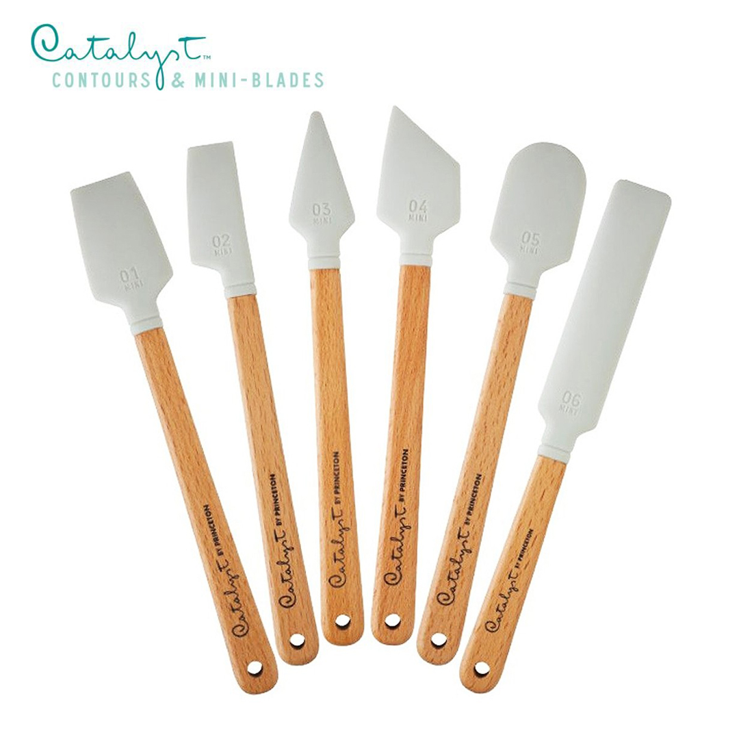 Princeton Catalyst Mini-blades are crafted from flexible silicone allowing artists a new form of expression. Mini-blades are mounted on artist brush handles to give artists a familiar yet innovative feel to them. Designed for use with heavy-bodied paints like oils, acrylics and water-miscible oils, as well as with encaustics and are heat resistant. They also work well with plaster, clay and even food crafting. The Mini-blades are made of FDA approved silicone and are terrific for sculpting cake frosting. And cleaning them has never been easier. Most messes, such as dried paint, either peels off or will come off with just soap and water; but for handling tougher messes, the blades detach from the handle and are dishwasher safe. The solvent-resistant silicone wipes clean, and dried paint can easily be peeled off their surfaces. Dishwasher safe, they can be separated from their handles for cleaning and replaced when dry.