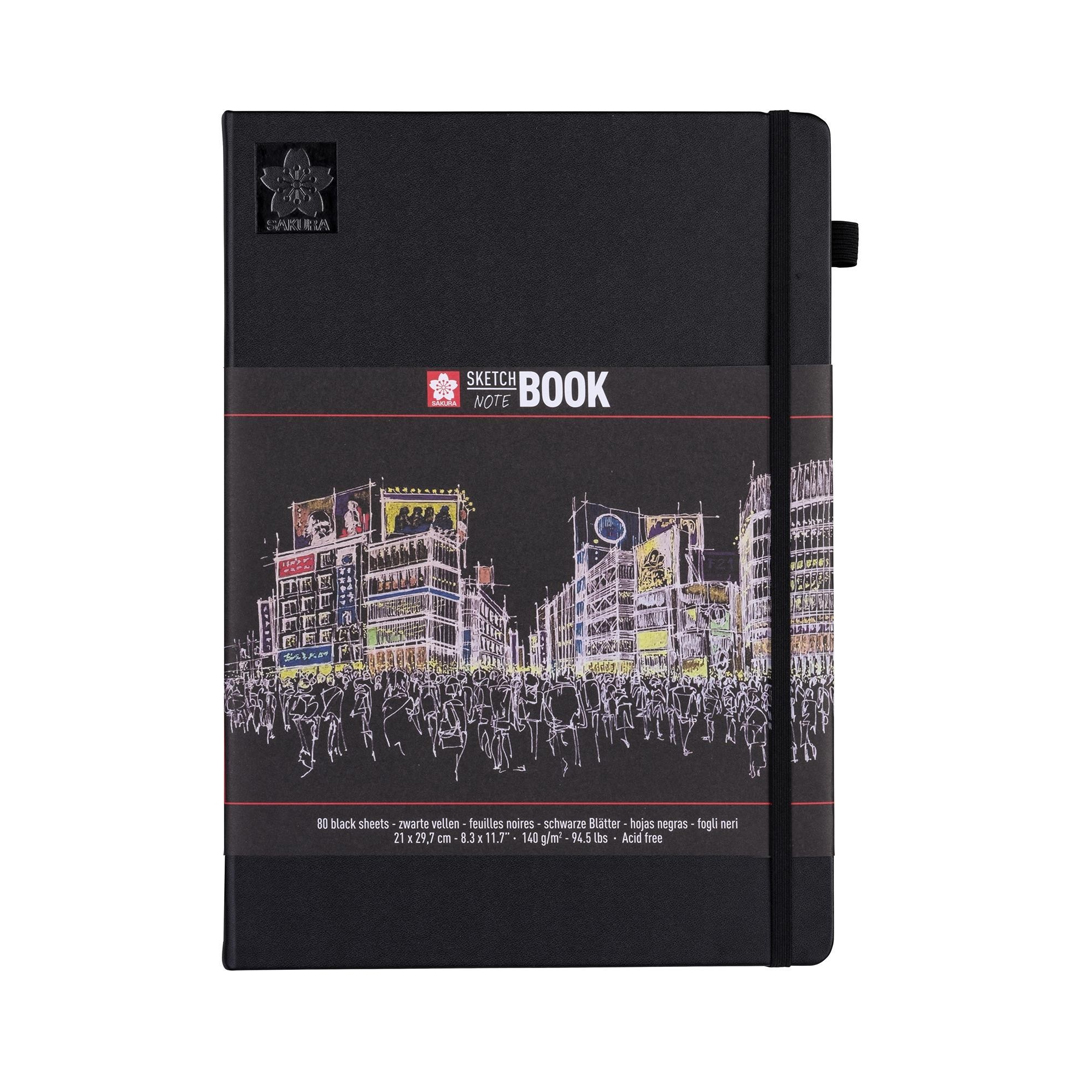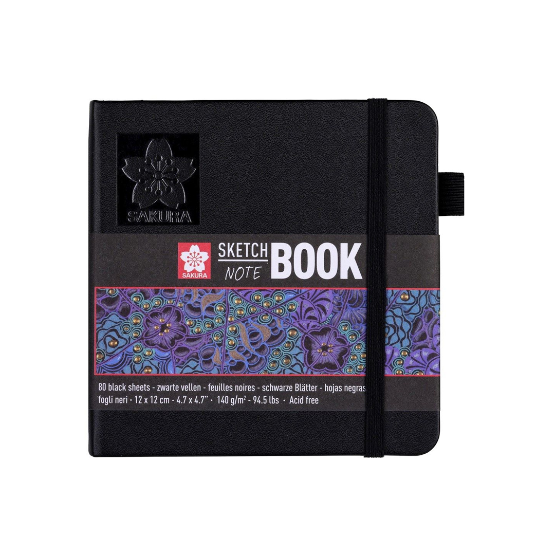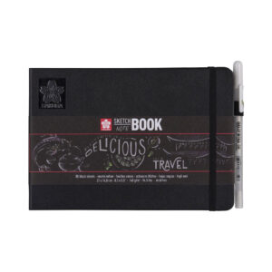 The Sakura Sketch – Note Book with black, acid free paper keeps all your ink, pencil, oil pastel or charcoal creations in one place. The exclusively illustrated sleeve can be used as a book mark. The hard cover book comes with a pen holder that perfectly fits pens such as the Pigma Micron and Sakura Gelly Roll. In the back of the Sketch Book an expandable envelope is included for storing sketches and notes. The elastic closure band ensures the book stays closed and compact when travelling. Sakura Sketch – Note Books are perfect for sketching and writing with Sakura products: Pigma Micron, Pigma Brush, Koi Coloring Brush Pen, Gelly Roll, Permapaque and the original Cray-Pas. They are available in creme white or black pages, in various sizes.