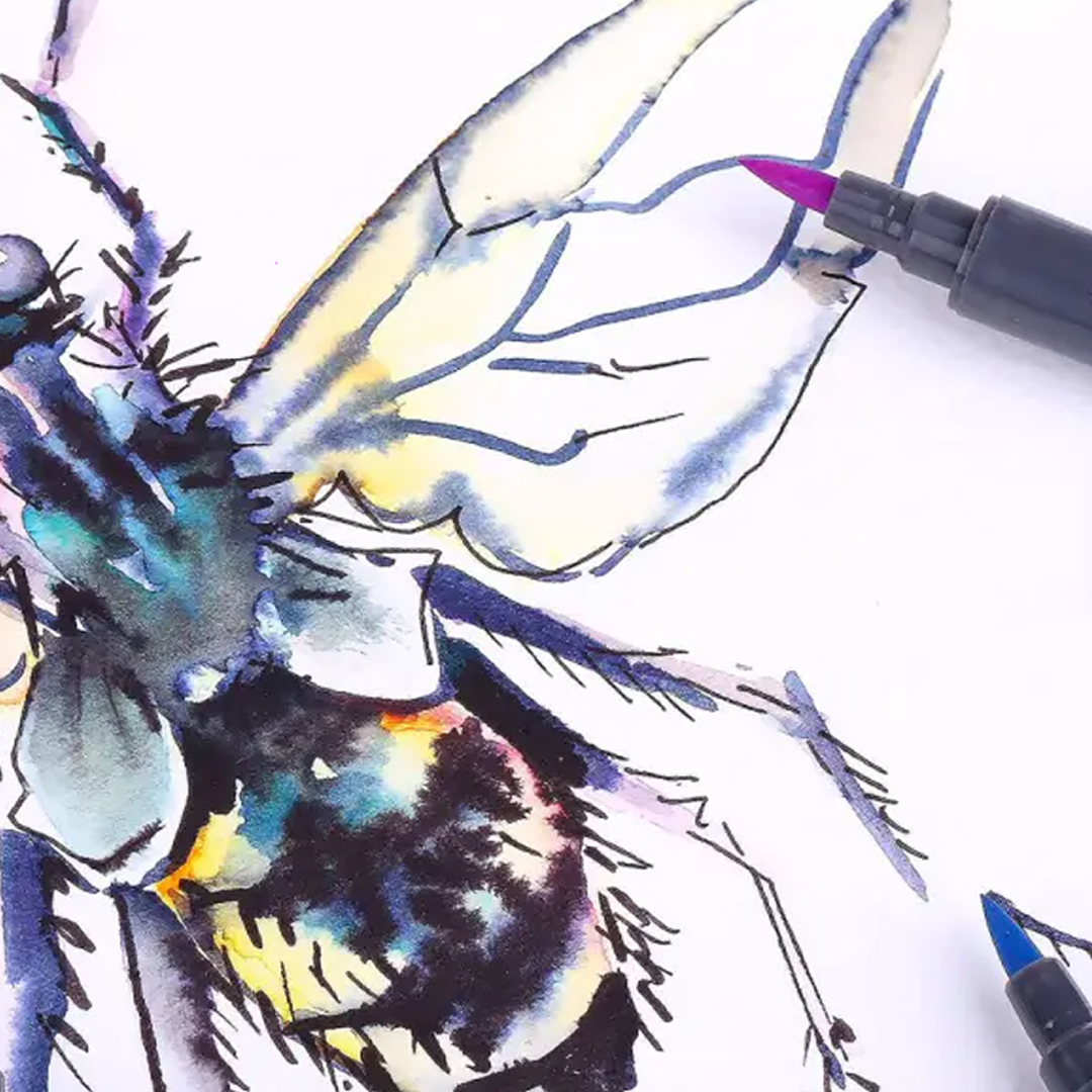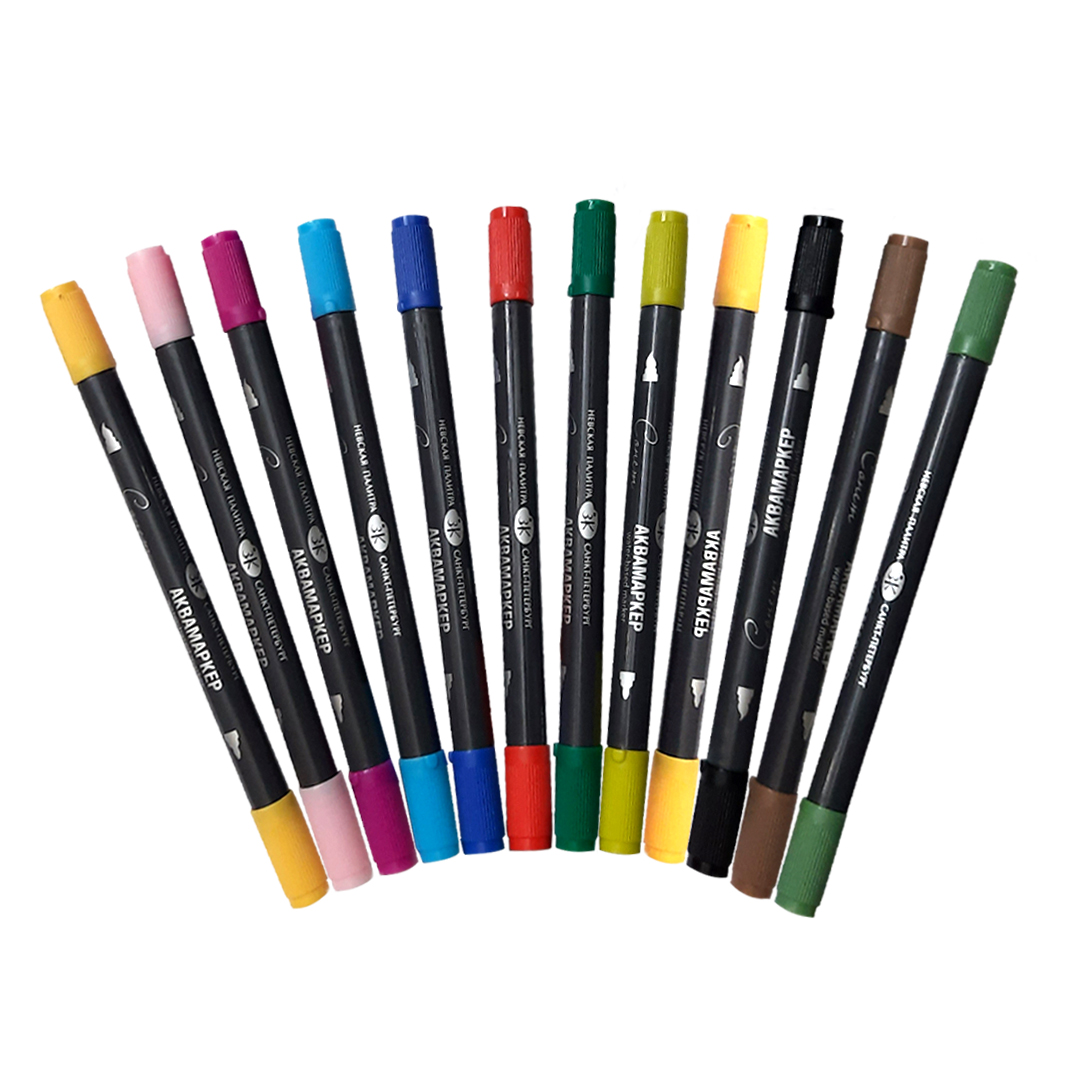 Water soluble light-resistant “Sonnet” aquamarkers are designed for painting, drawing and mixed techniques and perfectly combine the properties of markers and watercolours. To achieve a watercolour effect, blur the markers with a water soaked brush on paper, or palette. Aquamarkers have bright and saturated colors that perfectly blend with each other. The flexible brush tip is intended for soft painting and the fine core is designed for drawing details. It works best on Watercolour paper.