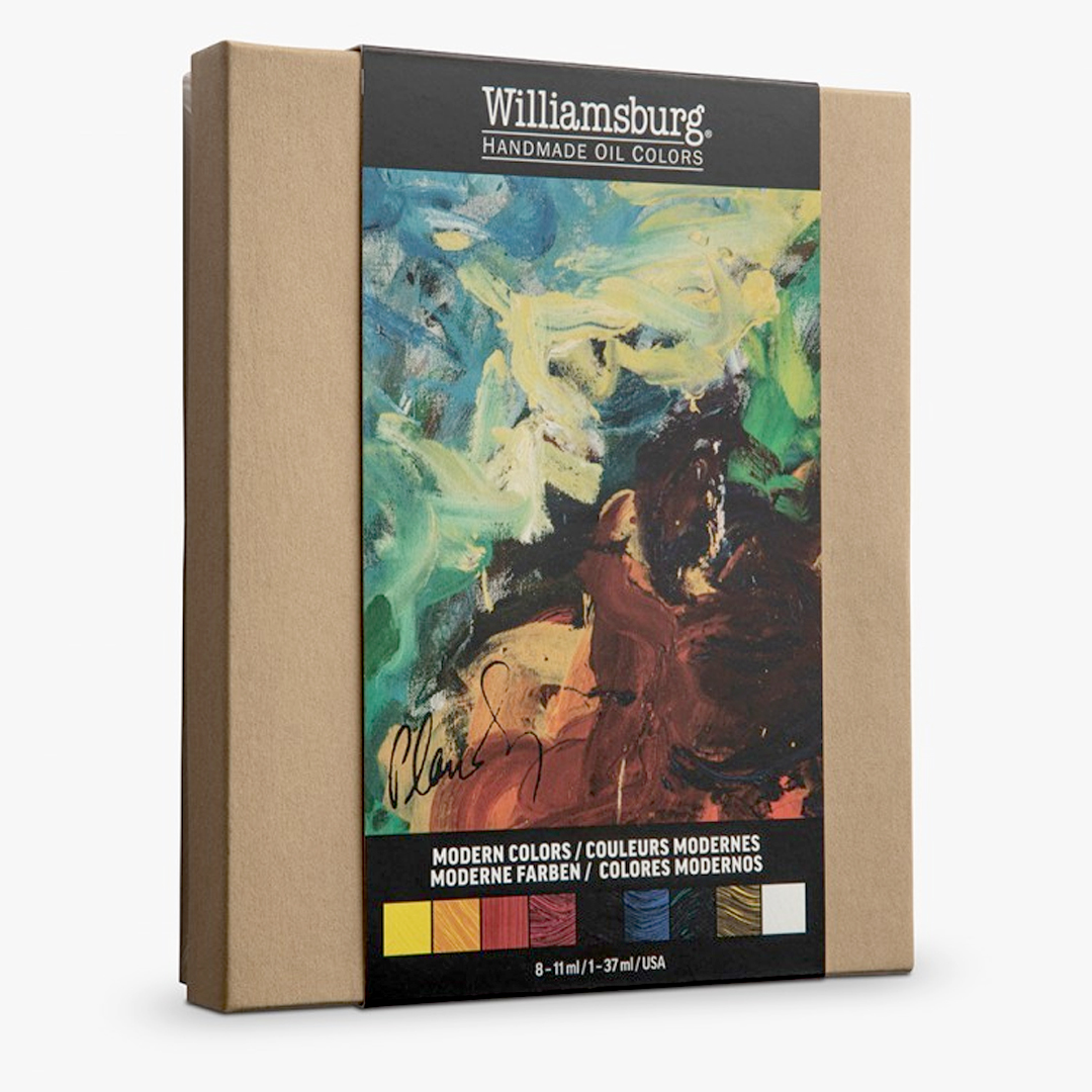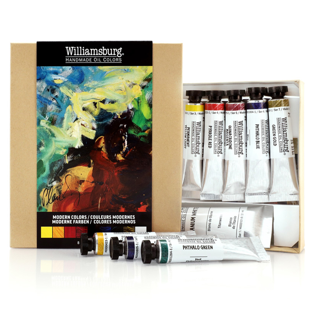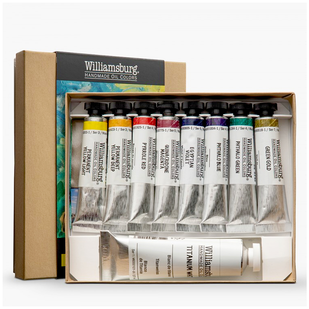 Contents: Permanent Yellow Light, Permanent Yellow Deep, Pyrrole Red, Quinacridone Magenta, Egyptian Violet, Phthalo Blue, Phthalo Green, Green Gold, all in 11ml tubes. Plus a 37 ml tube of Titanium White and the Modern Mixing Guide.